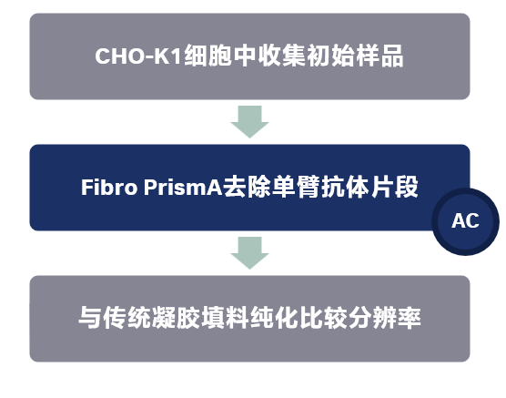 在双抗合成工艺当中,经常会产生多种抗体片段杂质。单臂抗体片段(缺少一边Fab臂的抗体)是生产重组抗体的过程中的一种潜在的副产物,特别是在双抗生产当中,因为双抗的铰链区可能包含更加脆弱的工程化序列。由于这些杂质与双抗之间的结构差异较小,所以如何将这些杂质有效去除,一直是一个重要的课题。本研究中,研究者利用全新的Fibro PrismA亲和层析技术,实现了双抗与单臂片段杂质的有效分离,并与传统凝胶填料进行了比较。