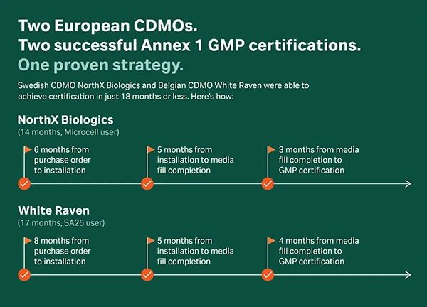 Fig 2. Timelines for two European CDMOs to quickly obtain GMP certifications aligned with the revised Annex 1 principles. See full infographic.