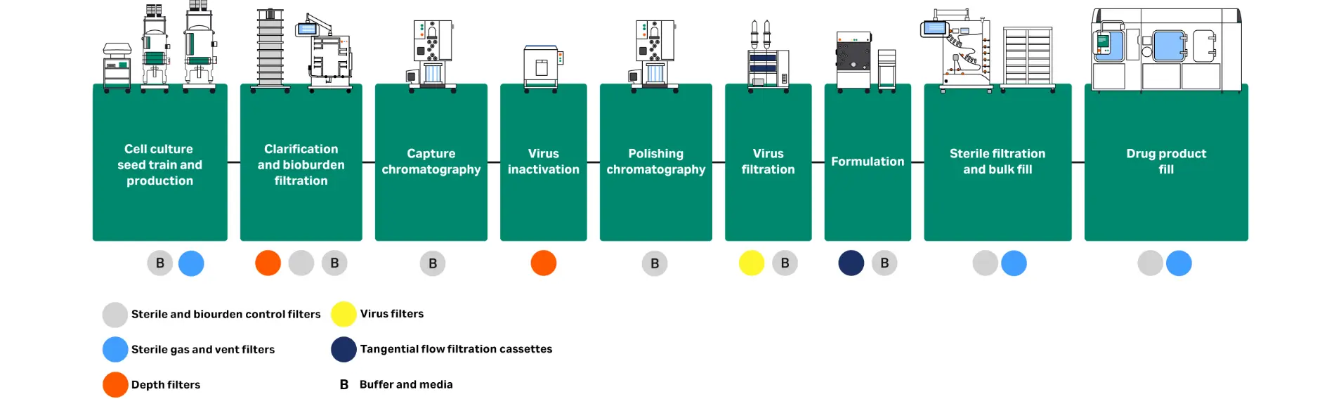 Figure 1. Liquid filtration operations in a typical mAb downstream process. B = buffer and media filtration.
