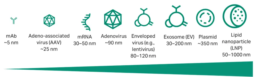 When we think about innovation in medicine, most will cite new modalities such as gene therapies, mRNA vaccines and cell therapy. Each of these provide their own unique manufacturing challenges and this often impacts the filters used in their production. Some push the very concept of size-based separation of product from contaminant to the limit (fig 5). Lentiviral vectors used in some gene therapies for example are typically 0.12 µm in size. Compared to potential bacterial contaminants that can be as small as 0.2 µm, this similarity can lead to considerable yield loses as the vectors are retained during sterilizing grade filtration.