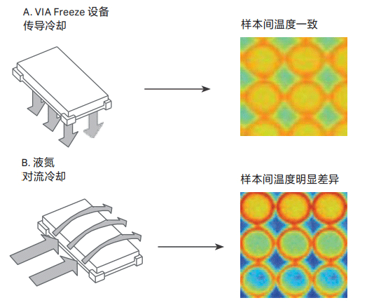 与需要液氮的工艺不同,VIA Freeze 设备使用电动斯特林冷冻 发动机控制降温速率,温度可降至 -100ºC,通过传导方式均 匀地降温,因此每个样本都具有相同的冷冻速率,并获得比 其他技术方案更高的一致性。