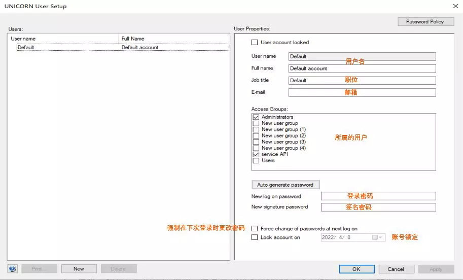 - 在跳出的对话框中选择 New,在右侧 User Properties 一栏中输入用户名、职位、E-mail,为该用户选择所属的用户组,初始密码以及初始签名密码,点击 OK。软件向注册的 E-mail 发送注册信,确认后即可成功新建用户;