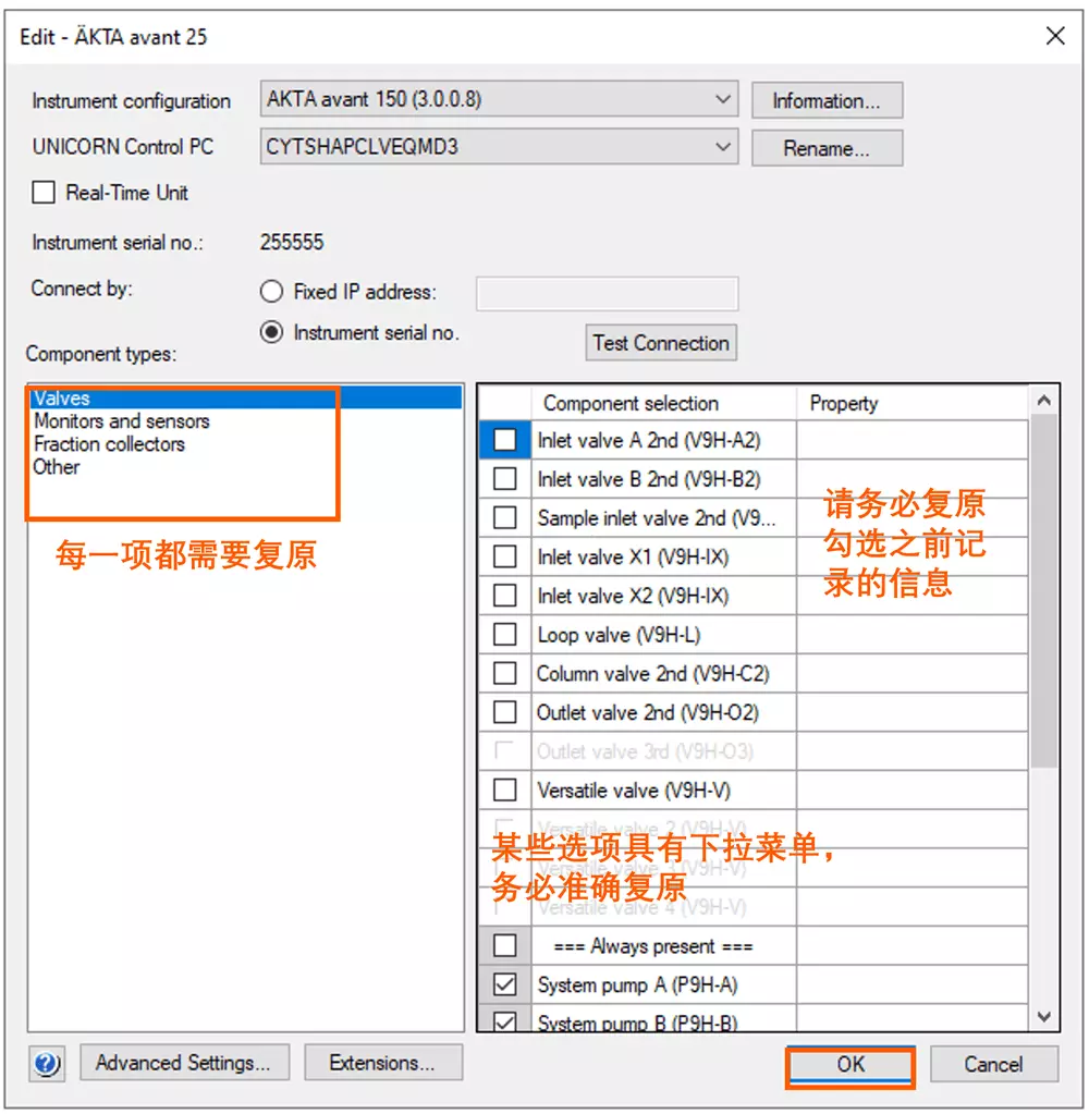 - 选中已连接的系统,并点击下侧 Edit 按钮, 记录 ÄKTA pure/avant 的模块,每个模块所勾选情况都须做好记录,后续需要这些信息。
