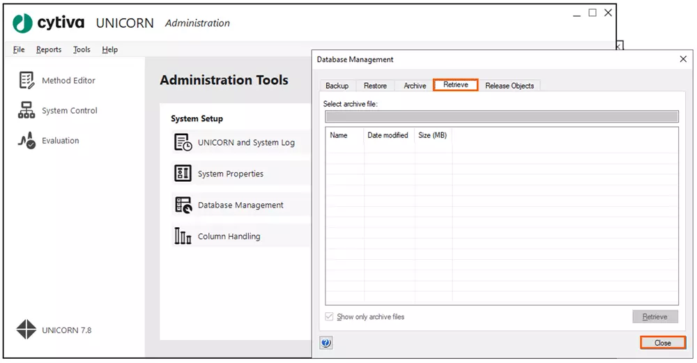 对于已归档的数据,在 Database Management → Retrieve 选项下选中对应的结果文件,点击右下角 Retrieve 即可恢复对应的数据。