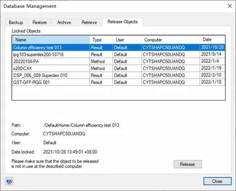 当软件意外关闭时可能会导致结果被锁定并显示为“只读模式”,此时在 UNICORN™ 软件的 Administration 模块中 Release 该结果即可,具体步骤如下图所示。