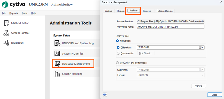 图1 Database Management界面进行数据归档