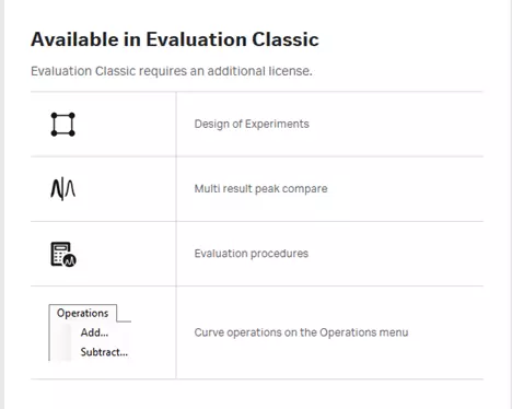 - Evaluation procedures 功能,该功能用于记录和保存结果分析评估过程。该评估过程可以作为方法保存。当运行该方法时,分析评估过程将自动执行。