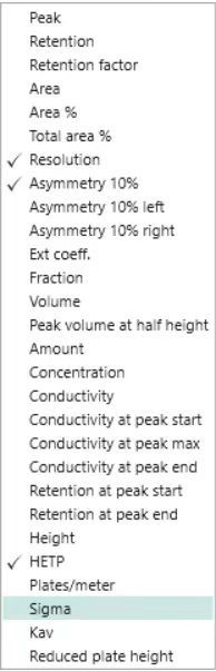 4. 积分结果参数显示的进一步选择,点击图1中标志4位置的小齿轮设置即可。可选的结果参数如图2所示,其中Plates/meter(理论塔板数)、HETP(理论塔板高度)、Asymmetry 10%(不对称因子),这三个为柱效评价时常用的三个指标。其余如Width(峰宽),Retention(保留体积)是吸收峰的主要数据,Resolution(分离度)、Area%(峰面积百分比)为多峰结果不同峰之间对比参数等,这些参数指标都在帮助我们更好的理解层析分离的过程。