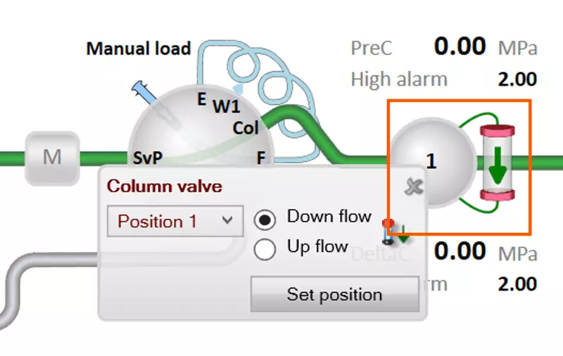 - 点击柱位阀图标可设置对应柱位的层析柱连入系统,默认是 By-pass 旁路,液体可以选择正向 Down flow 或反向 Up flow 流入柱子。