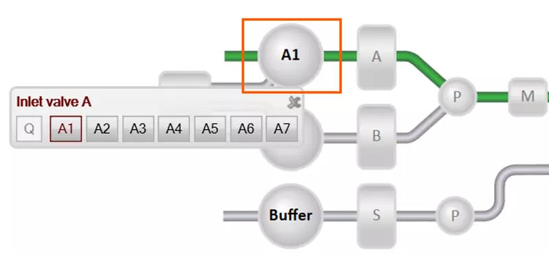 System Control 窗口的 View 下拉菜单把 Process Picture 勾选后,则窗口出现系统流路图,流路图中显示设备中的各个模块和阀门的图标,通过管路连接。点击图标可以设置模块的参数和阀门的状态,一旦设置流速,液体在设备管路中流动,液体流经流路和方向也会在流路图中显示绿色。ÄKTA™ 操作者可以通过流程图来控制系统,根据液体的流向从入口阀到收集器,可以点击图标来设置以下一些功能: