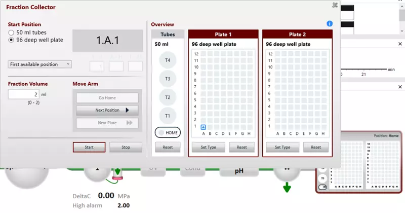 - 点击收集器图标可以设置收集器的参数,例如 F9-T双板收集器的常用的设置有:Set Type 为设置放入的收集板类型如96、24、48孔板,0.5 ml板等,First available position 设置开始收集的第一管位置,Fraction Volume 设置每管收集体积,Start 启动收集,Stop 停止收集。