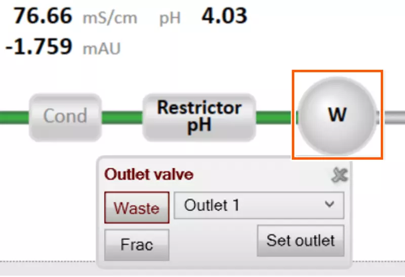 - 点击 Outlet valve 可以设置液体的排出选择,默认为 Waste 流入废液管路,Frac 流入收集器废液通道,Out1-10 流入对应的大体积收集瓶。