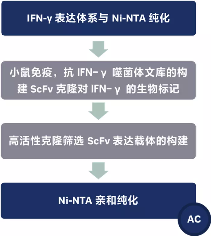 重组人IFN-γ蛋白在大肠杆菌中成功表达后离心将上清液上样到Ni-NTA柱,一部亲和纯化拿到重组蛋白,通过间接ELISA监测免疫后小鼠的纯化抗体的效价。为了筛选抗IFN-γ的scFv抗体,构建了具有大容量的重组文库。经过六轮生物淘选,成功分离并鉴定了高亲和力的scFv抗体,同样经一步Ni-NTA亲和纯化出的scFv对IFN-γ抗原具有特异性。