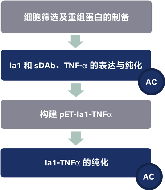 采用His标签纯化重组表达的Ia1,sdAb,此步采用的填料TALON Metal Affinity填料。TNFα采用的纯化方式为离子交换层析结合凝胶过滤层析,所使用到的层析柱分别为HiTrap Q XL、Superdex 75 16/600和RESOURCE S。在Ia1-TNFα融合蛋白的纯化策略中首先使用80%饱和硫酸铵沉淀法去除上清,将沉淀重新溶解到PBS缓冲液中之后使用TALON亲和一步纯化拿到融合的目标蛋白,后进行SDS-PAGE和凝胶过滤层析检测纯度,并使用流式细胞术对相关的结合特性进行表征。
