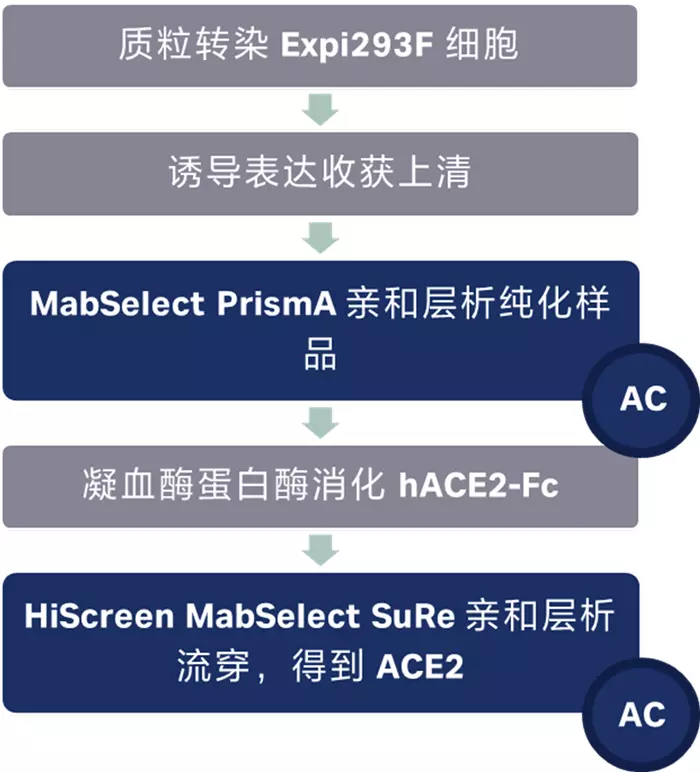 构建表达人源ACE2-Fc的质粒,并通过E.coli生产,将得到的质粒转染到Expi293F细胞中诱导表达单抗hACE2-Fc片段。收获培养上清液,使用MabSelect PrismA亲和进行纯化。洗杂步骤分别使用5CV的pH 7.2,20 mM NaPO4,150 mM NaCl缓冲液以及pH 7.2,20 mM NaPO4,1 M NaCl缓冲液,洗脱步骤使用3CV的pH 3.0,100 mM甘氨酸缓冲液,洗脱的组分使用2 M Tris-base 中和至50 mM终浓度。纯化的ACE2-Fc使用凝血酶蛋白酶进行消化后,经过HiScreen MabSelect SuRe亲和,去除可以结合的hACE2-Fc及Fc片段,得到hACE2,经过0.22 μm滤膜灭菌备用。