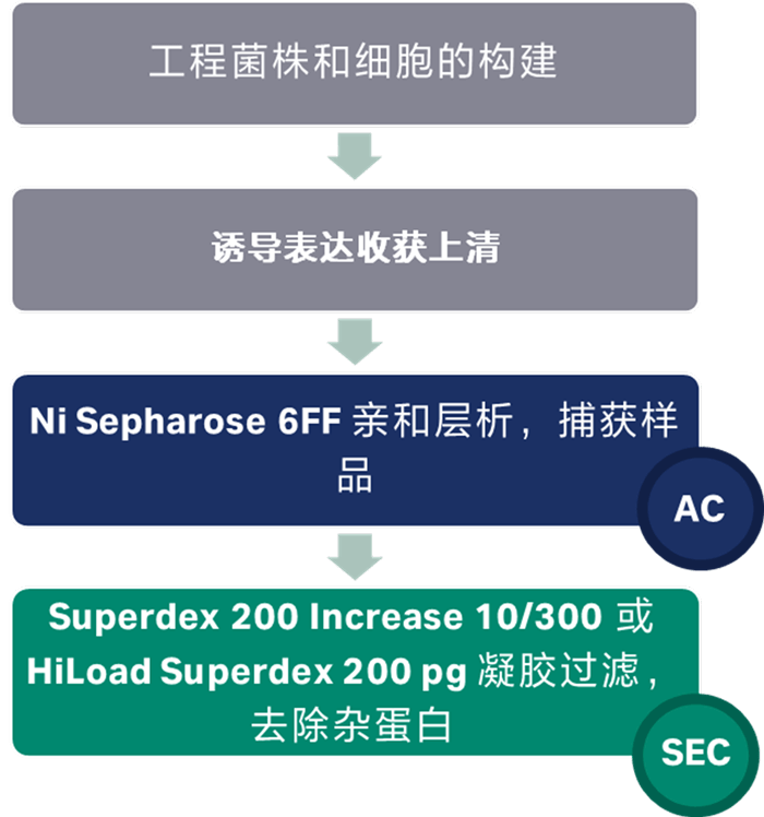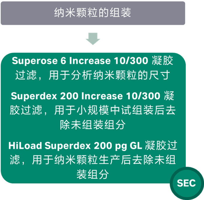 体外组装三聚体蛋白I53-50A和五聚体蛋白I53-50B蛋白,合成由120个亚基组成的复合物I53-50纳米粒子。组装后的纳米粒子使用不同的凝胶柱完成不同的功能。使用Superose 6 Increase 10/300凝胶过滤用于分析纳米颗粒的尺寸,Superdex 200 Increase 10/300凝胶过滤用于小规模中试组装后去除未组装组分,HiLoad Superdex 200 pg用于纳米颗粒生产后去除未组装部分。