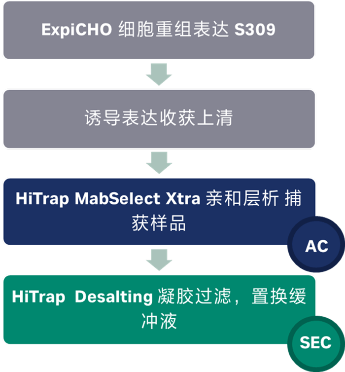 重组S309蛋白以Fab片段形式通过质粒瞬时共转染到expiCHO细胞中表达重链和轻链。蛋白通过HiTrap MabSelect Xtra进行纯化,后接一步脱盐柱,将其置换到pH 7.2,20mM NaPO4,150 mM NaCl缓冲液中,得到的抗体片段使用0.22 μm滤膜进行除菌,并放于4℃保存备用。