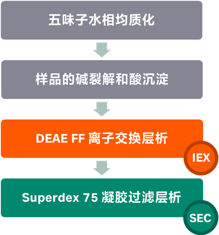 将晒干的五味子用纯水进行均质化处理,处理后的样品经1 M NaOH调至pH = 9.5,在35度孵育3小时后离心取上清。上清液经过1 M HCl充分混合调节至等电点将样品沉淀,孵育1 h时后离心取沉淀,沉淀用纯水溶解并用纯水透析。