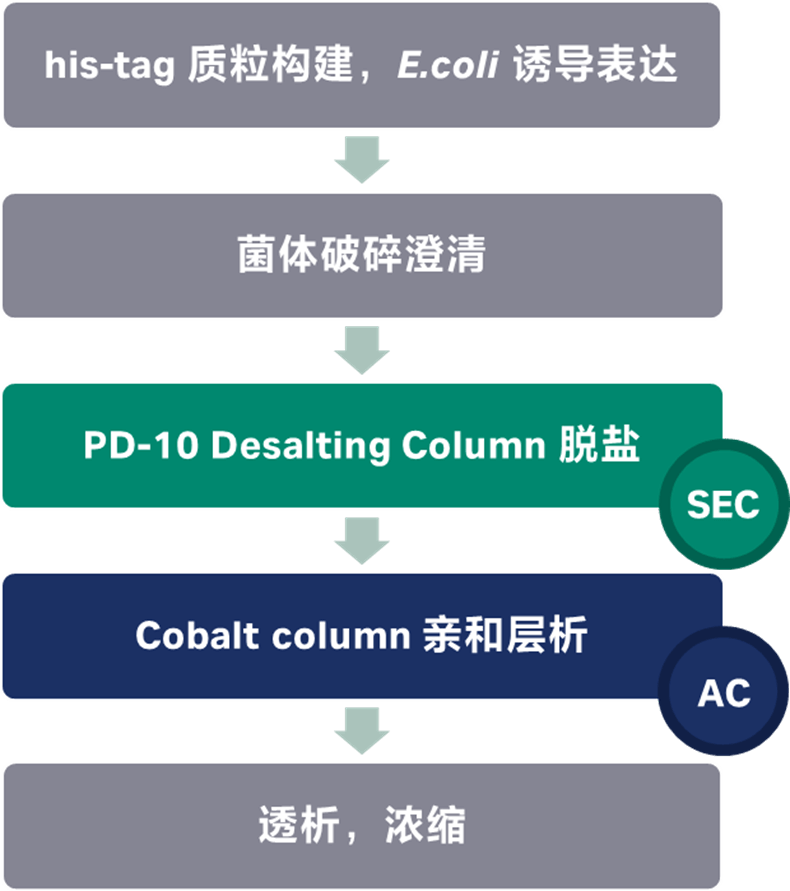 可溶蛋白部分使用Co柱进行亲和纯化。Co离子的离子半径略大于Ni离子,对his标签的亲和力稍弱,但是对标签蛋白的纯化纯度相较于Ni柱有一点优势。样品的结合缓冲液为10 mM Tris-HCl, pH 8.0,10 mM imidazole,洗脱液为10 mM Tris-HCl, pH 8.0, 150 mM Imidazole。