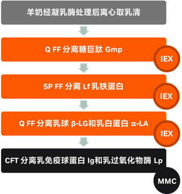 羊奶相对于牛奶来说更易消化,过敏率低,能够更加容易制作奶酪,而生产奶酪的副产品就是乳清蛋白。乳清中β-lactoglobulin 乳球蛋白 (β-Lg)占据了主要成分,其他成分包括α-lactalbumin 乳白蛋白 (α-La), albumin 白蛋白 (Alb), immunoglobulin 乳免疫球蛋白 (Ig), lactoferrin乳铁蛋白(Lf) 和 lactoperoxidase 乳过氧化物酶 (Lp)。在乳酪的产生过程中,在凝乳酶的水解作用下,k-casein酪蛋白产生糖巨肽Glyco(caseino)macropeptide (Gmp)。除此之外还有peptone蛋白胨和lysozyme 溶菌酶 (Lz)、osteopontin 骨桥蛋白。Lz, Lf 和 Lp蛋白一般具有抗菌功能。Lf能够螯合天元素用于食品营养强化和食品加工过程的抑制细菌生长,食品抗菌包装技术。Gmp可用于苯丙酮尿症phenylketonuriacs疾病的营养治疗,除此之外还具有抵抗毒物,细菌和病毒功能,以及促进双歧杆菌的生长。Ig乳免疫球蛋白能够提供免疫支持。α-La和β-Lg是具有很高价值的食品添加剂,主要归因于其胶凝和发泡的能力,最近又用于生产纳米管和微球封装系统。除了食品工业领域的应用之外,乳清蛋白也用于制药和化学工业。通过乳清中不同蛋白等电点的差异,能够通过离子交换层析配合磷灰石填料对乳清中的各种蛋白进行层析分离纯化,并具有产业放大的巨大优势。