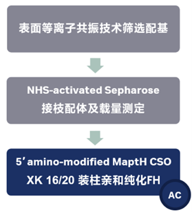 纯化FH: 1ml 、5.2mg 经5′ 氨基,修饰 MaptH CSO 的亲和填料装入XK16 ,层析过程流速为 0.5 mL/min ;50 mM NaCl和10 mM MgCl2的50 mM Tris-HCl缓冲液(pH 7.5)平衡后上样, 5 mg 血浆来源的 FH 或 45 mL 含有重组 FH 的细胞培养上清液稀释后进样;然后使用含 100 mM EDTA的pH 8 、50 mM Tris-HCl 缓冲液洗脱。