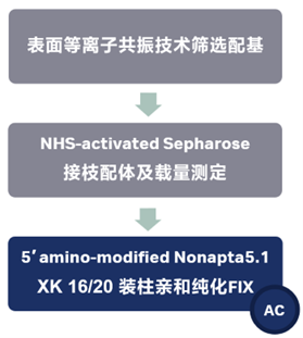 纯化FIX: 1ml经5′氨基修饰的 Nonapta5.1 的凝胶装柱 ,层析过程流速为 0.5 mL/min ;pH 7.4,50 mM Tris-HCl 缓冲液平衡后上样;2.6 mg 血浆 FIX稀释到150 mM NaCl、0.5 mM CaCl2 和 1 mM MgCl2,上样体积16.3 mL;2 M NaCl 缓冲液洗涤后用 200 mM EDTA洗脱 ;最后进行柱子再生和消毒。