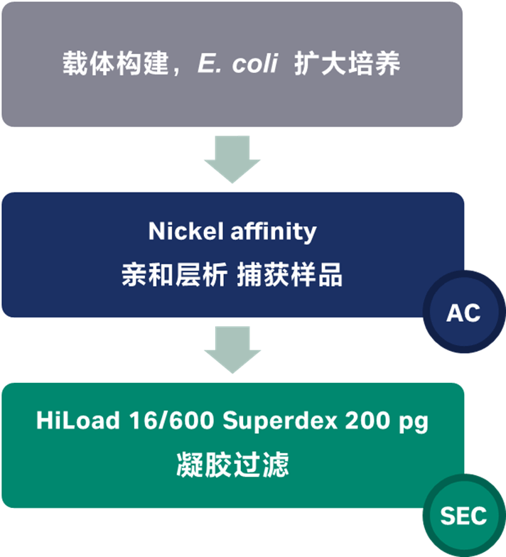 该纯化的具体路线如下:第一步,亲和层析,使用Ni+柱进行快速和大量捕获。第二步,凝胶过滤层析进行精纯,使用HiLoad 16/600 Superdex 200 pg柱子,平衡缓冲液使用25 mM HEPES ,pH 7.5。