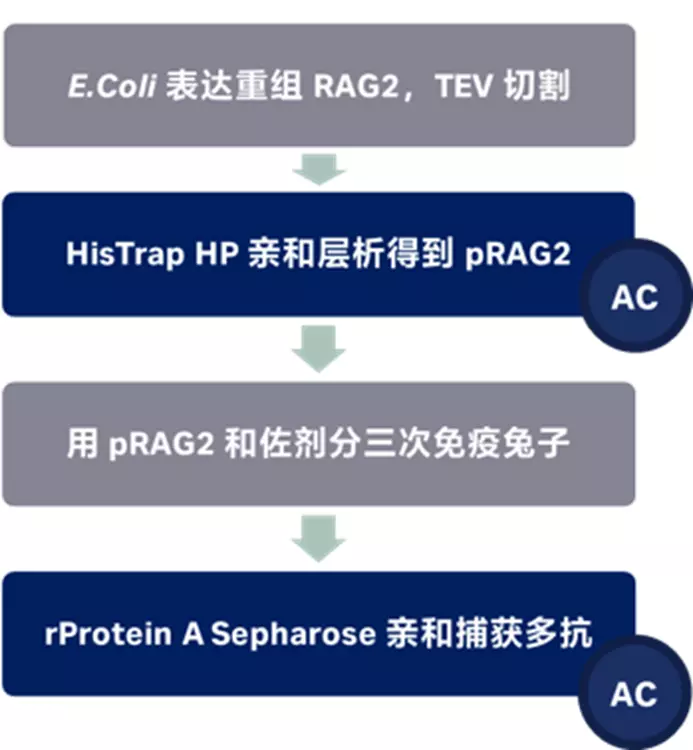 用制备的pRAG2蛋白与完全弗氏佐剂免疫兔子,从实验兔的心脏中收集血液,离心后使用rProtein A Sepharose层析柱得到纯化后兔抗pRAG2多克隆抗体。