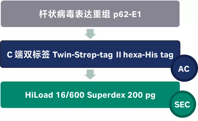 对于每个构建体,使用单独的真实p62信号序列,并且将Twin-Strep-tag II放置在hexa-His标记的前面,然后将其添加到C末端以促进进一步的纯化过程。使用HisTrap HP 5 mL柱亲和层析的方式从细胞上清液中回收可溶性E蛋白,然后使用StrepTrap HP 5 mL柱通过另一轮亲和层析纯化。对于结晶,使用带有20 mM Tris-HCl和150 mM NaCl (pH 8.0) 的运行缓冲液的HiLoad 16/600 Superdex 200 pg进一步纯化蛋白质。