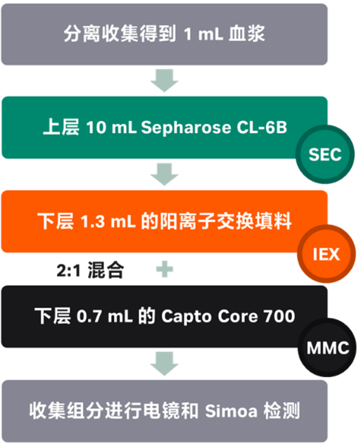 方案二: SEC+CIEX方案,因为EVs通常带负电荷,故选择利用阳离子交换填料用来分离EVs和脂蛋白,研究者装填了顶层10 ml Sepharose CL-6B,底层2 ml 阳离子交换填料的双模式层析柱;