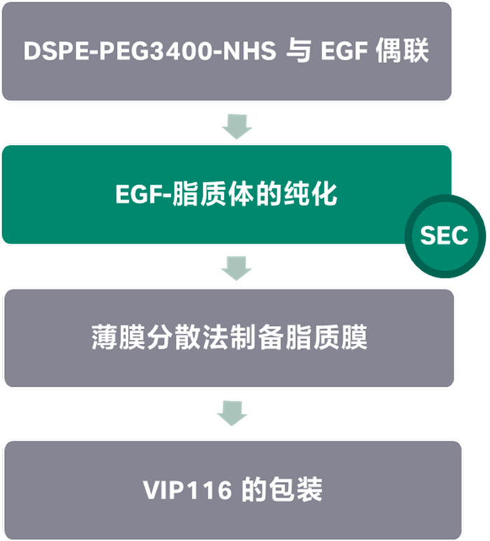 第一步是将DSPE-PEG3400-NHS与EGF偶联,作者使用3.6 mg DSPE-PEG3400-NHS与300 μg鼠EGF在PBS pH 7.4室温过夜搅拌偶联。第二步将EGF偶联的脂质体进行纯化,作者使用分子筛 Sephadex G-150对偶联的PEG脂质微球进行纯化,分离去除未偶联的EGF蛋白。然后,作者使用薄膜分散法制备脂质膜。具体做法是将EGF偶联的脂质溶于乙醚,N2保护减压干燥成脂质膜。再将脂质膜与VIP116在60 ℃水合,完成VIP116的包装。最后,为了将纯化得到的治疗用脂质体用于进一步的体外实验中,作者使用多种检测手段对脂质体进行表征,包括Western、QCM-D等等。体外实验表明脂质体对EGFR有较强的靶向作用,且对VIP116的包装效率较高。