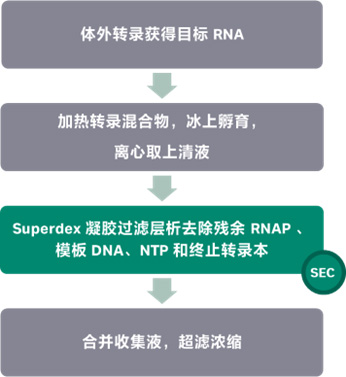 转录和核糖酶裂解后的混合物通常需要长时间分离才能产生全长的成熟 RNA。传统上,纯化需要进行变性聚丙烯酰胺凝胶电泳(urea-PAGE电泳),来实现目标 RNA 与 RNAP、DNA 模板、未裂解的前体 RNA、流产转录本和 NTP 的分离。这种方法虽然有效,但也有若干缺点。首先,这一步骤至少需要两天才能完成,显著限制实验速率。其次,洗脱步骤会在凝胶中残留RNA,从而降低总产量。第三,洗脱液通常含有丙烯酰胺,会降低终产物的纯度。urea-PAGE 的替代方法包括标签亲和层析纯化法和基于快速液相色谱法(FPLC)的方法。标签亲和层析方法通常需要一个能被核酸酶裂解的标签(即串联 MS2 标签),该标签可与 his 标记的 MS2 蛋白结合。这种技术可配合额外的凝胶过滤层析(SEC),制备出毫克级结晶质量的中小型 RNA。而较大的目标 RNA(200 nt以上)会大大降低这种技术的效率。另外,目前已有基于 SEC 的方法能在原生条件下有效分离目标 RNA 与反应物和副产物。不过,此类技术需要繁琐的预处理步骤来去除 RNAP 和转录混合液。