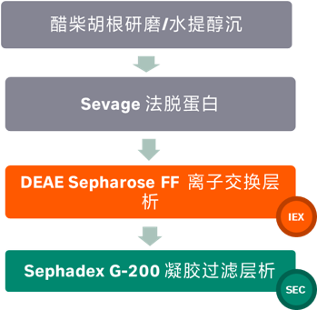 过滤后,沉淀物用Sevage法脱蛋白。上清液经透析、冷冻干燥得到总醋柴胡多糖(VBCP)。