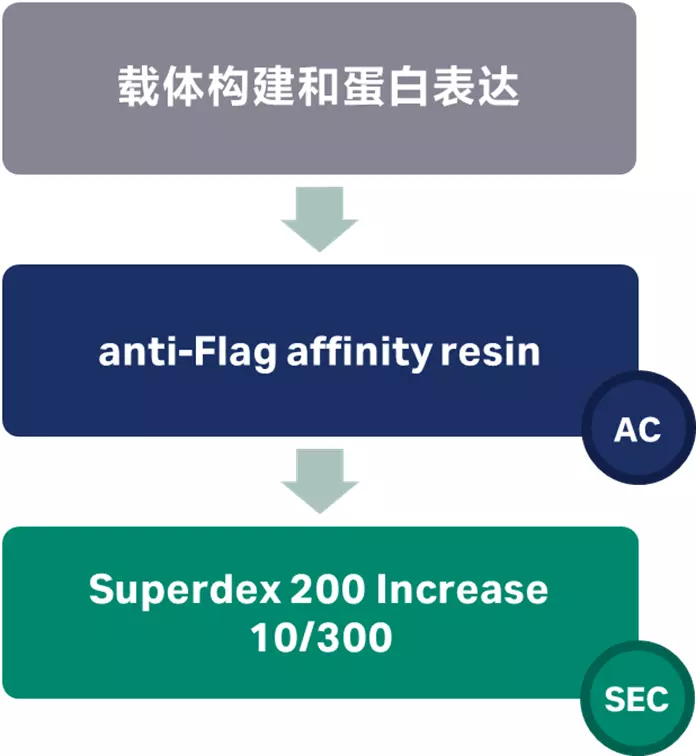 CGRPR 是异二聚体,由降钙素受体样受体 (CLR) 和受体活性修饰蛋白 1 (RAMP1) 构成,属于B1 类 GPCR。在昆虫细胞中表达蛋白,收获细胞后冻存。将收获的细胞在 20 mM HEPES pH 7.4、100 mM NaCl、2 mM MgCl2 和 3 mM CaCl2 中解冻,并辅以蛋白酶抑制剂、Benzonase(37.5 U/mL,Merck Millipore)和 3C 蛋白酶( 10 mg/mL;从 CLR 上切割标签),有或没有 1 或 10 mM CGRP(Chinapeptides)。添加LMNG和CHS至最终浓度分别为 0.5% 和 0.03%,并在 4℃ 下 1 小时使目的蛋白溶解。30,000 g 下离心15分钟去除不溶物,取上清室温下2小时结合M1 anti- FLAG affinity resin。装入玻璃柱中并用20个柱体积的 20 mM HEPES pH 7.4、100 mM NaCl、2 mM MgCl2、3 mM CaCl2、0.01% (w/v) LMNG和0.0006% (w/v) CHS、含或不含1 mM CGRP洗涤,使用无钙缓冲液(20 mM HEPES pH 7.4、100 mM NaCl、2 mM MgCl2、10 mM EGTA、含或不含 1 mM CGRP、0.01%(w/v ) LMNG 和 0.0006% (w/v) CHS、0.2 mg/mL FLAG 肽)洗脱目的蛋白。样品浓缩后,在 Superdex 200 Increase 10/300 柱 (Cytiva) 上进行精细纯化,提前用 20 mM HEPES pH 7.4、100 mM NaCl、2 mM MgCl2、含或不含 80 mM CGRP(以确保高受体占有率)、0.01% (w/v) LMNG 和 0.0006% (w/v) CHS平衡凝胶柱。