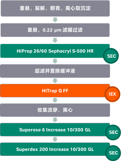 将蛋白质冷冻细菌沉淀在冰上融化,并在冷的Tris 缓冲盐溶液中(20 mM Tris pH 7.5,150 mM NaCl)中重新悬浮(5 mL/g 湿细胞质量)。加入裂解组分(0.5 mg/mL溶菌酶,1 mM三(2-羧乙基)磷酸三钠(TCEP),每100 mL一片SIGMAFAST无EDTA蛋白酶抑制剂混合片,0.5 mM MgCl2,和25单位/mL 苯甲酸酶核酸酶)并在冰上裂解10分钟。然后在60%振幅下超声5分钟(每次8秒,停16秒),直到不再黏稠。超声后,样品在4°C离心8000rcf 15分钟。样品随后经历了10% 聚乙二醇(PEG)8000沉淀(裂解液加入至10% PEG 8K和500 mM NaCl,冰上孵育30分钟,然后在8000 rcf 离心15分钟)。上清液被丢弃,沉淀物用5 mL TBS pH 7.5重新悬浮,并通过0.22 μm注射器滤膜过滤。然后将蛋白样品通过Sephacryl S-500 纯化。样品组分被汇集,并使用离心过滤单元(30 kDa分子量截止)进行缓冲液交换至AIEX缓冲液(20 mM Tris pH 7.5),然后通过线性梯度进入AIEX 缓冲液和1 M NaCl 的HiTrap Q-FF 纯化。收集样品流穿液,并以10000 rcf 离心10分钟,然后将其加载通过预先平衡的TBS pH 7.5的Superose 6 10/300 GL 柱进行最终纯化。