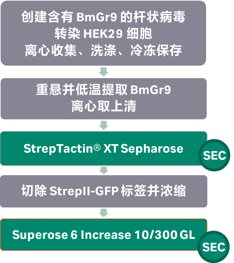 由BmGr9的Pro2–Ser449残基(天然C末端)组成的合成构建体,被克隆到pEG BacMam载体中,随后连接了氨基末端的Strep-tag II、超折叠GFP和HRV 3C蛋白酶位点。含有BmGr9编码序列的杆状病毒在Sf9细胞中创建。HEK293细胞在37°C的悬浮培养中生长于培养基中,补充有2%(v/v)胎牛血清(FBS)和1%(v/v)GlutaMAX,并在8%(v/v)二氧化碳环境中培养,直到细胞密度达到约3 × 106个细胞每毫升,然后以约1的感染复数转导杆状病毒。12小时后,向培养基中加入10 mM丁酸钠,并将温度降低至30°C。细胞在约48小时后通过离心收集,并在磷酸盐缓冲盐水(pH 7.5)中洗涤一次。细胞沉淀在液氮中冷冻并储存在–80°C,直到需要时使用。