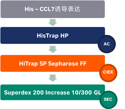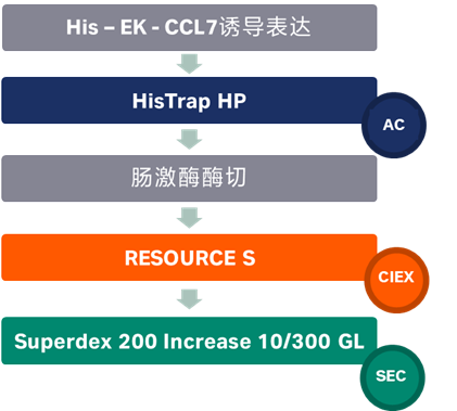 为了大规模制备CCL7,作者选择采用两种设计路线, His-CCL7与His-EK-CCL7。两者的表达质粒构建后转入感受态细胞,并进行诱导表达。表达完成后,含有His – CCL7的细胞沉淀重悬于裂解液中,超声裂解,离心过滤后上清加载到Ni Sepharose HP柱上进行亲和层析。亲和层析中洗脱下的结合蛋白经缓冲液稀释加载到Hitrap SP FF阳离子柱上进行第二次纯化。His- EK- CCL7第一步使用Ni Sepharose HP进行亲和层析。洗脱下来的His -EK-CCL7透析后使用肠激酶消化,之后可用到两种方法分离出天然的CCL7。一是加载到Resource S阳离子交换柱用NaCl梯度洗脱,二是加载到Ni Sepharose HP柱上收集流传液。 将纯化出的His-CCL7与天然的CCL7加载到 Superdex 200 Increase 10/300 GL柱,监测洗脱曲线,分析洗脱组份。