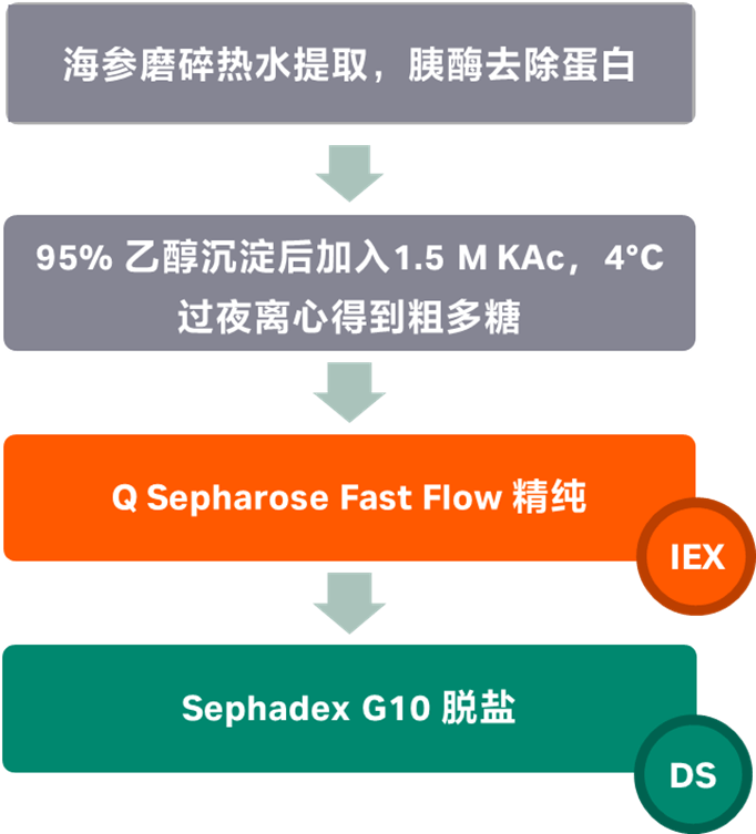 干海参切碎、均质化后浸入丙酮中以去除脂质。加入胰酶后冷却、离心。向上清液中加入1倍 95% (v/v)乙醇得到沉淀并溶解。加入1.5 M KAc过夜离心收集得到粗多糖,溶于蒸馏水中透析,冻干。