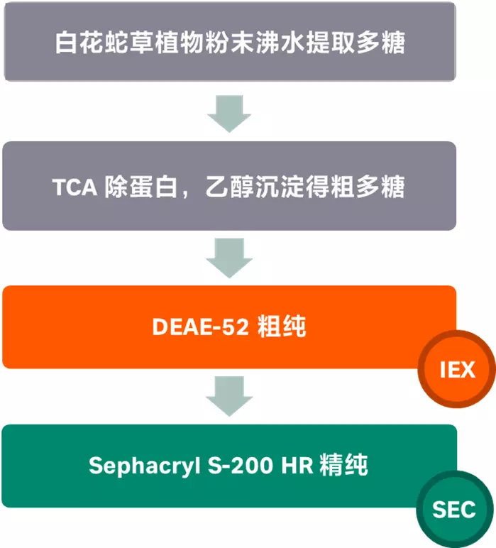 白花蛇草广泛分布于东亚和东南亚,具有很高的临床药用价值,主要包括抗肿瘤、抗炎、抗氧化、增强免疫力等药理作用。临床上,根据中国药典 (2020年版),含白花蛇草的中成药约有30余种, 白花蛇草的主要成分是多糖、黄酮类、蒽醌类和萜类。多糖作为白花蛇草的主要成分和重要活性物质,是一种有效的免疫调节剂,具有抗肿瘤、抗炎、抗氧化、增强免疫力等多种药理活性。不同的原料和提取方法导致白花蛇草多糖的结构和生物活性存在差异。阴、阳离子交换色谱和凝胶过滤色谱是多糖分离和纯化最广泛使用的方法。白花蛇草多糖根据极性分离,酸性或中性成分通过DEAE-纤维素离子交换和DEAE-52离子交换分离,然后由Sephadex G系列和Sephacryl S系列等根据分子量进行精细分离是目前多糖研究领域较为常见的一种工艺方法。