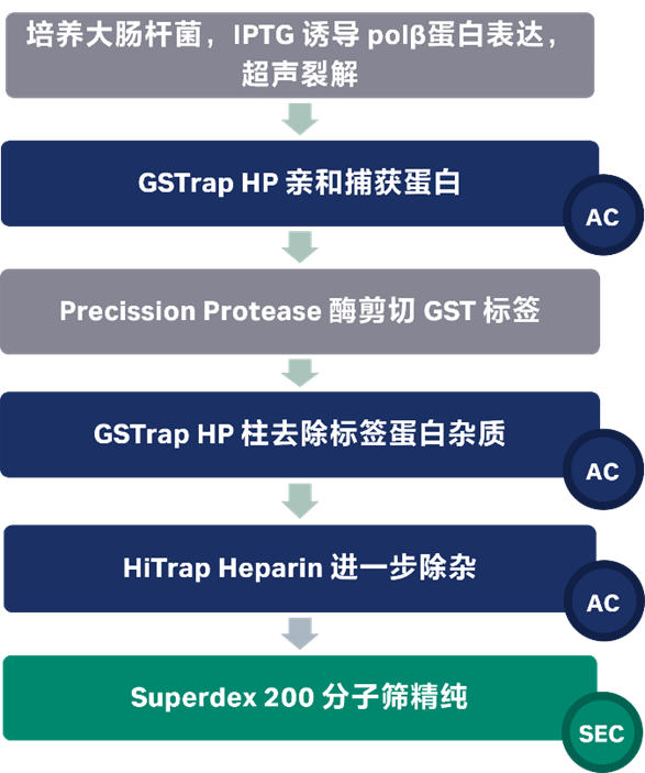 polβ的表达和纯化:将带有 GST 标记的人野生型全长(1-335)polβ(pGEX-6p-1)的 BL21(DE3) pLysS 大肠杆菌中在37℃ 的 TB 培养基过表达。当 OD600 达到 1.0 时,用 0.5 mM IPTG 诱导细胞,过表达在 20℃ 下持续过夜。在含有 1× PBS(pH 7.3)、200 mM NaCl、1 mM Dithiothreitol(DTT)和 1 mM PMSF 的裂解缓冲液中于 4℃ 超声裂解细胞后,将细胞裂解液以 31 000 × g 离心 90 分钟,然后过滤澄清。将澄清的上清液装入 GSTrap HP 柱,用裂解缓冲液洗涤,然后用含有 50 mM Tris-HCl(pH 8.0)和 10 mM 还原型谷胱甘肽的洗脱缓冲液洗脱。为了裂解 GST 标记,重组 polβ 蛋白与 PreScission 蛋白酶在含有 1× PBS(pH 7.3)、200 mM NaCl 和 1 mM DTT 的缓冲液中于 4℃孵育 16 小时。Polβ 蛋白随后通过预平衡的 GSTrap HP 层析柱,以去除裂解的标签,然后将不含 GST 标签的蛋白质上样到HiTrap Heparin层析柱上进一步纯化,该色谱柱用含 20 mM Tris-HCl(pH 7.0)、50 mM NaCl、2 mM β-巯基乙醇和 5% 甘油的结合缓冲液平衡。然后用线性梯度洗脱蛋白质,最高可达 1 M NaCl。最后,在含有 50 mM Tris-HCl(pH 7.0)、200 mM NaCl、1 mM DTT 和 5% 甘油的缓冲液中,用 Superdex 200 凝胶过滤柱纯化 polβ。
