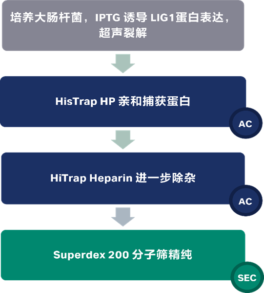 LIG1的表达和纯化:在大肠杆菌中过表达人类野生型his-tag LIG1全长(1-919),并在含有卡那霉素(50 μg/ml)和氯霉素(34 μg/ml)的TB培养基中37℃培养。当 OD600 达到 1.0 时,用 0.5 mM 异丙基 β-D-硫代半乳糖苷(IPTG)诱导细胞,并在 20℃下继续过表达过夜。离心后,在含有 50 mM Tris-HCl(pH 7.0)、500 mM NaCl、20 mM 咪唑、2 mM β-巯基乙醇、5% 甘油和 1 mM 苯甲基磺酰氟(PMSF)的裂解缓冲液中裂解细胞。 细胞裂解液在 4℃下以 31 000 × g 离心 90 分钟,之后经过滤澄清后上样到 HisTrap HP 层析柱,该色谱柱之前已用含有 50 mM Tris-HCl(pH 7.0)、500 mM NaCl、20 mM 咪唑、2 mM β-巯基乙醇和 5% 甘油的结合缓冲液平衡过。用结合缓冲液清洗色谱柱,然后在 4℃ 下用咪唑梯度洗脱(0-500 mM)。收集的组分随后上样到 HiTrap Heparin 柱上,该柱用含 20 mM Tris-HCl(pH 7.0)、50 mM NaCl、2 mM β-巯基乙醇和 5% 甘油的结合缓冲液平衡,蛋白质用最高为 1 M 的 NaCl 线性梯度洗脱。在含有 50 mM Tris-HCl(pH 7.0)、200 mM NaCl、1 mM DTT 和 5% 甘油的缓冲液中,用 Superdex 200 凝胶过滤层析柱进一步纯化 LIG1 蛋白。