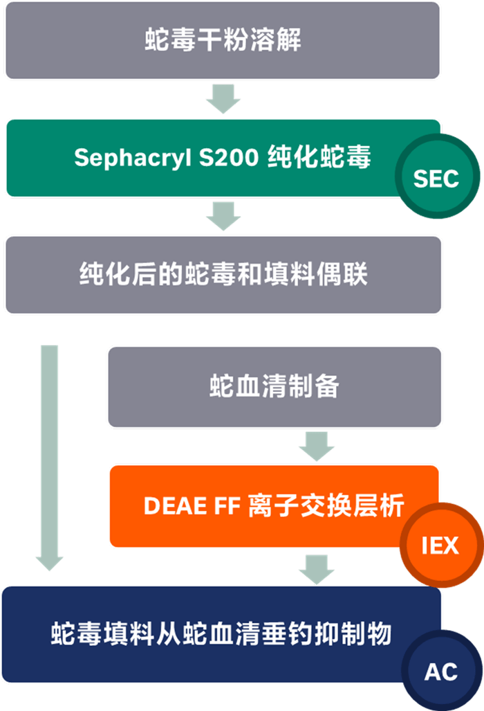 从10条B. jararaca 蛇中尾静脉穿刺取血,放置4度过夜,1200 × g 离心15 min获得上清即蛇血清,7 mL的蛇血清换液至25 mM Tris buffer, pH 7.5中,然后利用DEAE填料 (1.6 × 2.5 cm) 纯化,上样后先用25 mM Tris buffer,pH 7.5,100 mM NaCl洗杂,然后100-500 mM NaCl线性梯度洗脱。将线性梯度洗脱下来的样品置换到PBS溶液中。