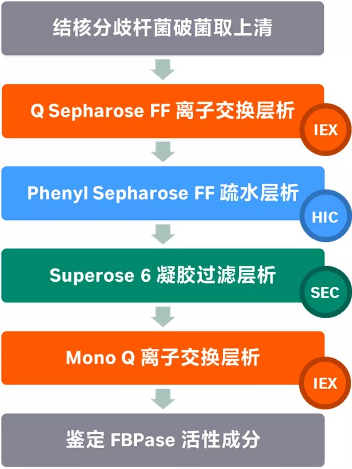 结合分岐杆菌 (Mycobacterium tuberculosis, Mtb) 是一种有适应能力的能够感染细胞内的细菌,能够引起结核病,可以在巨噬细胞中休眠,Mtb的碳代谢显示Mtb优先选择Fatty acid脂肪酸作为碳来源而非糖酵解的底物,而糖异生过程 (生物体将多种非糖物质转变成葡萄糖或糖原的过程) 是脂肪酸转化为生物能的关键步骤,糖异生过程的限速步骤为FBPase酶 (果糖-1,6-二磷酸酯酶) 的催化过程,将fructose 1,6-bisphosphate (FBP) 转化为fructose 6-phosphate (F6P),该催化过程也是阻断Mtb的碳代谢是潜在的药物靶点。Mtb的基因组中GLPX被认为是Mtb编码的唯一的FBPase酶。但是将敲除了GLPX的Mtb菌株仍然可以在依赖糖异生作用的碳源 (甘油glycerol,丁酸盐butyrate) 上生存,说明GLPX并不是唯一的FBPase,菌体中应当存在其他的FBPase。菌体裂解液上清通过四步层析,最终收集的组分经过SDS-PAGE,将条带的浓度分布对比活性的强弱分布,鉴定出分子量约25 kD的条带,经过LC-MS/MS分析出序列信息,该蛋白为GPM2。将GLPX和鉴定出来的新FBPase即GPM2进行双敲除后的Mtb突变菌株才不能够通过糖异生作用增殖。同时双敲除的Mtb突变菌株感染了动物后,滴度不能提高,也不能够让动物肺部产生病变,而单敲除GLPX和GPM2其中之一的突变株和野生型突变株都能在动物肺部增殖并引起肺部病变损伤。
